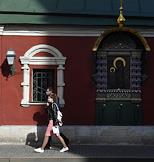 Виды Москвы во время режима самоизоляции из-за угрозы распространения коронавирусной инфекции COVID-19. Жанровая фотография. Женщина у иконы Богоматери на фасаде православного храма.