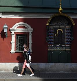 Виды Москвы во время режима самоизоляции из-за угрозы распространения коронавирусной инфекции COVID-19. Жанровая фотография. Мужчина и женщина в медицинских масках проходят мимо здания старого православного храма.
