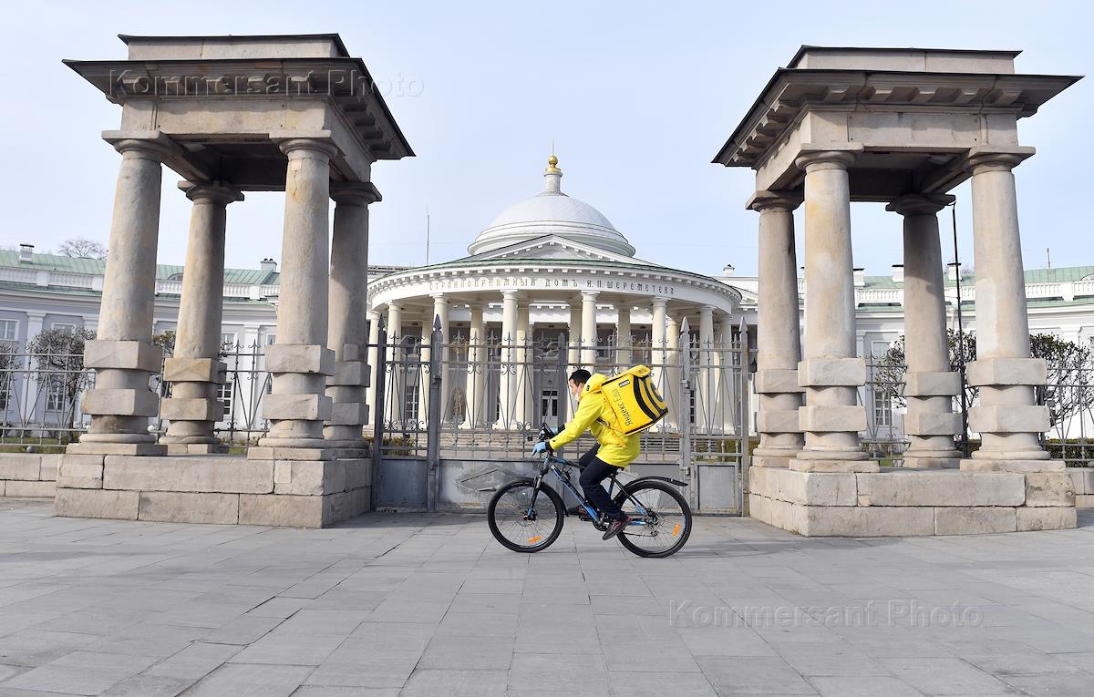 Виды Москвы во время режима самоизоляции из-за угрозы распространения коронавирусной инфекции COVID-19. Жанровая фотография. Курьер службы доставки "Яндекс. Еда" едет на велосипеде.