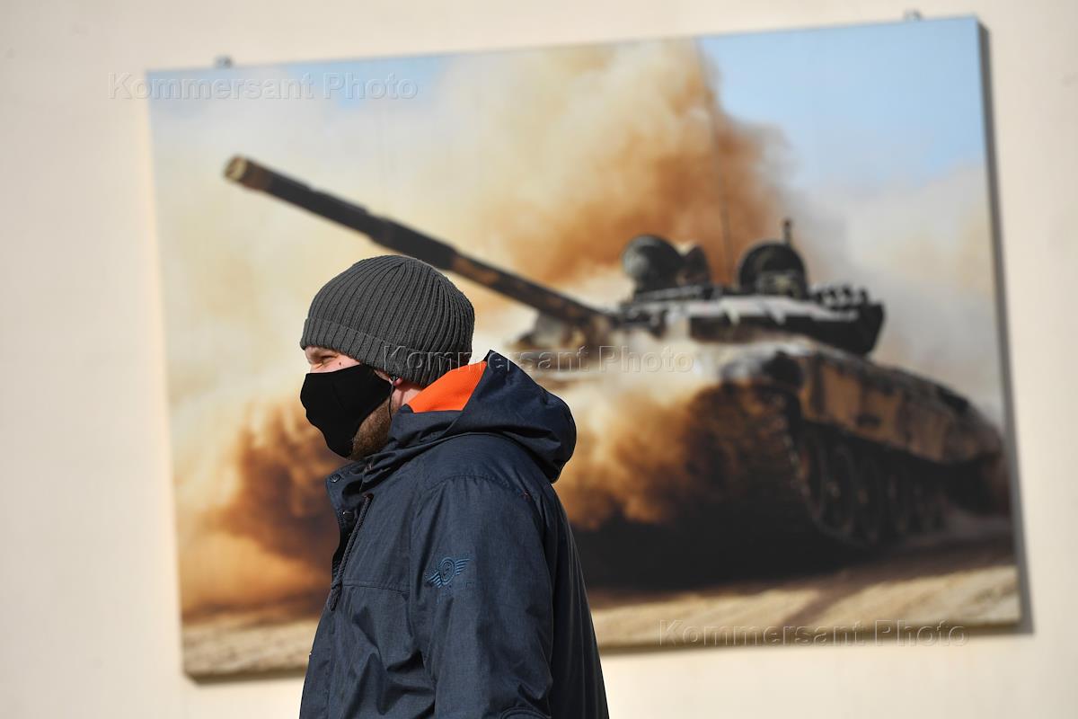 Виды Москвы во время режима самоизоляции из-за угрозы распространения коронавирусной инфекции COVID-19. Жанровая фотография. Мужчина в черной медицинской маске на фоне фотографии танка.