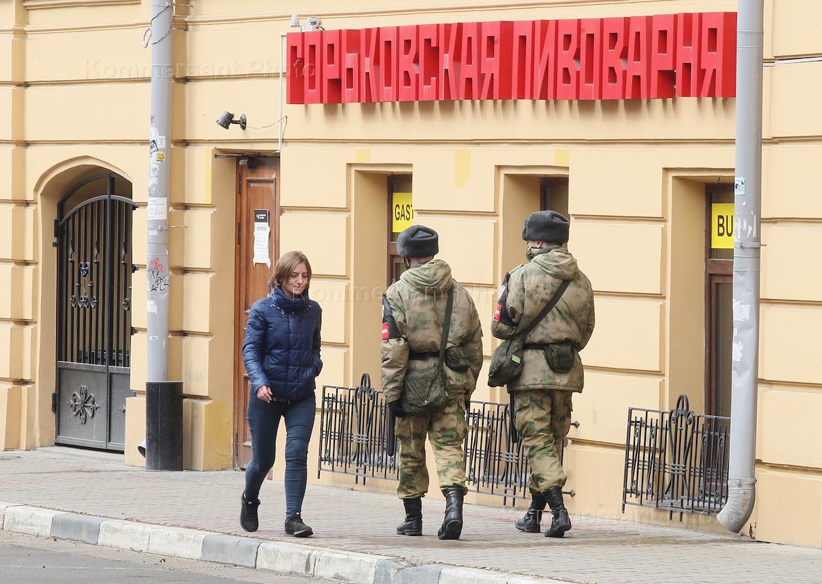 Виды Нижнего Новгорода во время режима самоизоляции из-за опасности распространения коронавирусной инфекции COVID-19. Жанровая фотография. Патруль Росгвардии идет мимо ресторана "Горьковская пивоварня".