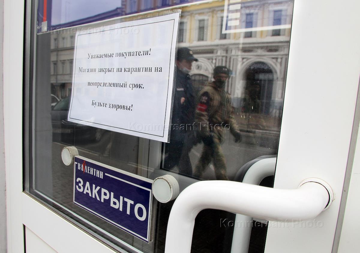 Нижний Новгород во время режима самоизоляции из-за опасности распространения коронавирусной инфекции COVID-19. Жанровая фотография. Патрульные Росгвардии идут мимо двери с табличкой "Закрыто" и объявлением: "Магазин закрыт на карантин на неопределенный срок".