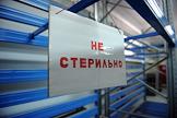 Центр радиационных технологий Института ядерной физики (ИЯФ) имени Г.И.Будкера Сибирского отделения Российской академии наук. Жанровая фотография. Табличка с надписью "Стерильно".
