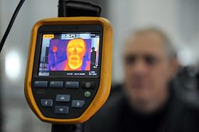 Меры предосторожности против коронавирусной инфекции COVID-19. Жанровая фотография. Проверка температуры тепловизором в Центру радиационных технологий Института ядерной физики (ИЯФ) имени Г.И.Будкера Сибирского отделения Российской академии наук.