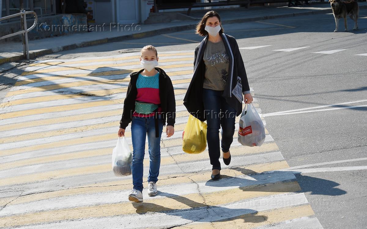 Алушта во время режима самоизоляции из-за опасности распространения коронавирусной инфекции COVID-19. Жанровая фотография. Женщина с девочкой в медицинских масках с пакетами в руках переходят улицу.