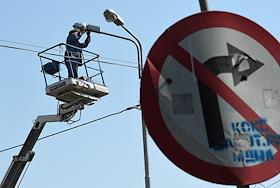 Виды Алушты во время режима самоизоляции из-за опасности распространения коронавирусной инфекции COVID-19. Жанровая фотография. Сотрудник жилищно-коммунального хозяйства во время ремонта уличного фонаря.