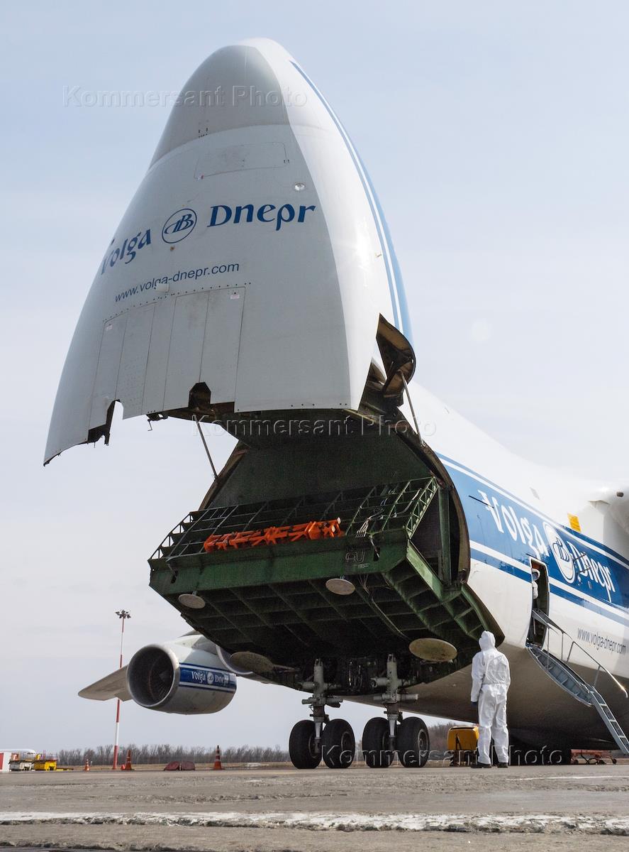 Kazan during self-isolation regime caused by the danger of the coronavirus COVID-19 spread. Welcoming ceremony of the special plane carrying medical masks and equipment for the production of woven and non-woven materials from China at the Gabdulla Tukai International Airport in Kazan. Plane of the Volga-Dnepr Airlines is seen during unloading.