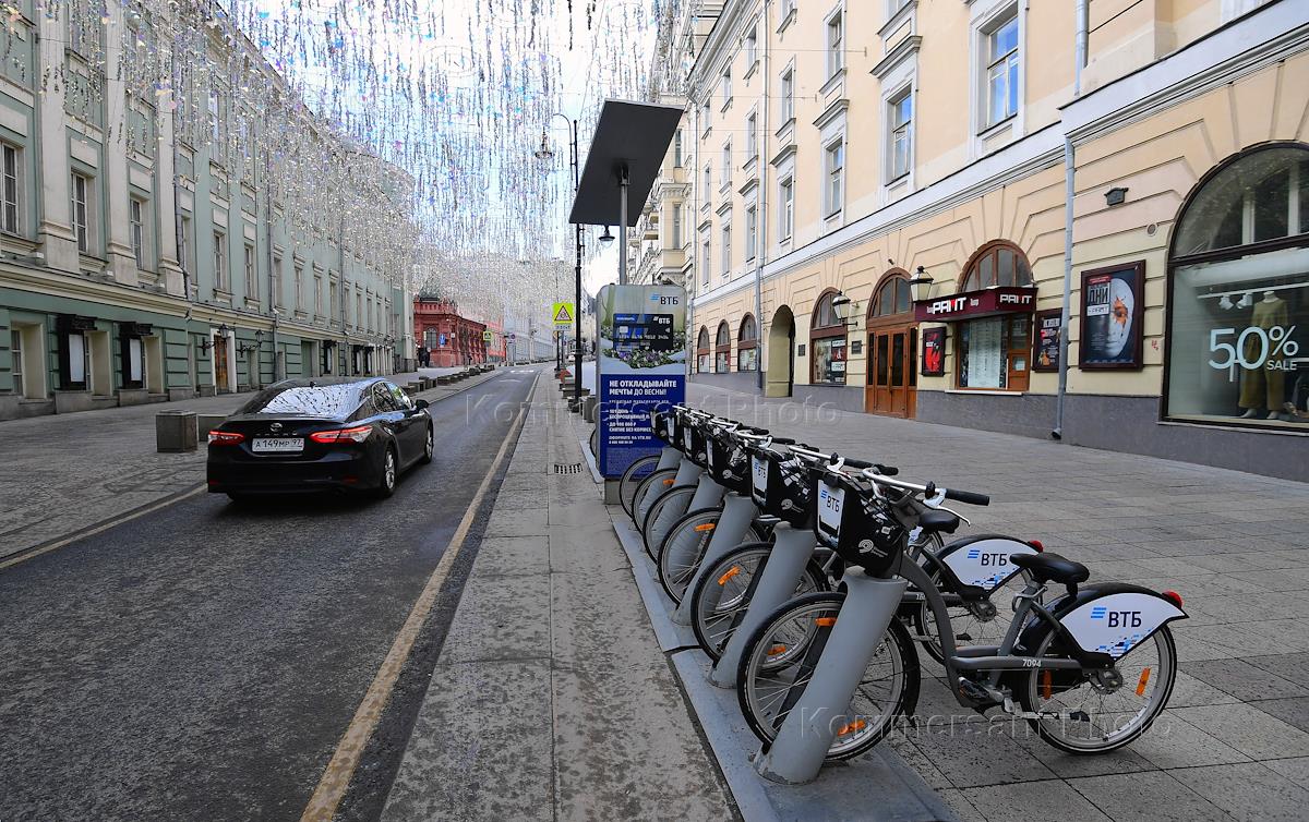 Виды Москвы во время режима самоизоляции из-за опасности распространения коронавирусной инфекции COVID-19. Начало работы велопроката. Московские волонтеры и курьеры на время режима самоизоляции смогут воспользоваться велопрокатом бесплатно. Жанровая фотография. Пункта проката велосипедов на улице Большая Дмитровка.