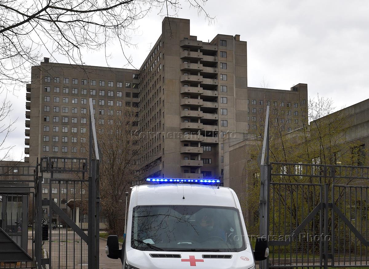 Moscow during self-isolation regime caused by the danger of the coronavirus COVID-19 spread. Genre photo. Veterans Hospital No. 3 repurposed for coronavirus COVID-19 patients. Ambulance leaves the hospital area.