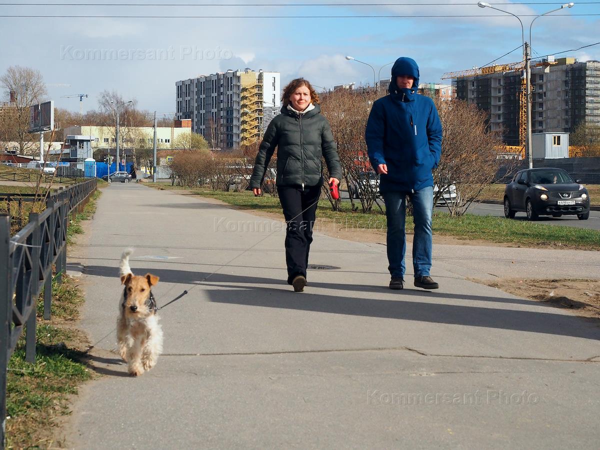 Виды Санкт-Петербурга во время режима самоизоляции из-за опасности распространения коронавирусной инфекции COVID-19. Жанровая фотография. Мужчина и женщина выгуливают собаку.
