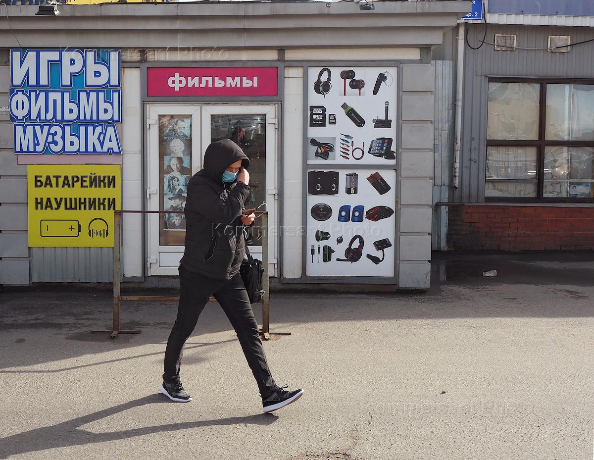 Виды Санкт-Петербурга во время режима самоизоляции из-за опасности распространения коронавирусной инфекции COVID-19. Жанровая фотография. Молодой человек в медицинской маске проходит мимо магазина.