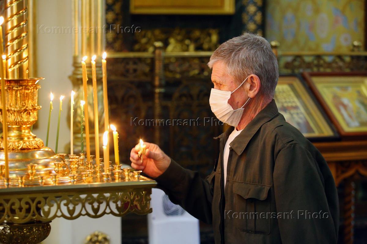Прихожане в медицинских масках во время богослужения в Свято-троицком кафедральном соборе.