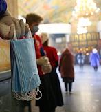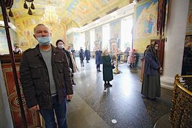 Богослужение в Свято-троицком кафедральном соборе. Волонтер с масками.