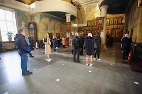 Богослужение в Свято-троицком кафедральном соборе. Волонтер с бутылкой дезинфицирующей жидкости.