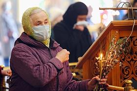 Богослужение в Свято-троицком кафедральном соборе в честь праздника Входа Господня в Иерусалим (Вербное воскресенье) во время пандемии коронавируса COVID-19. Жанровая фотография. Верующие в медицинских масках во время богослужения.