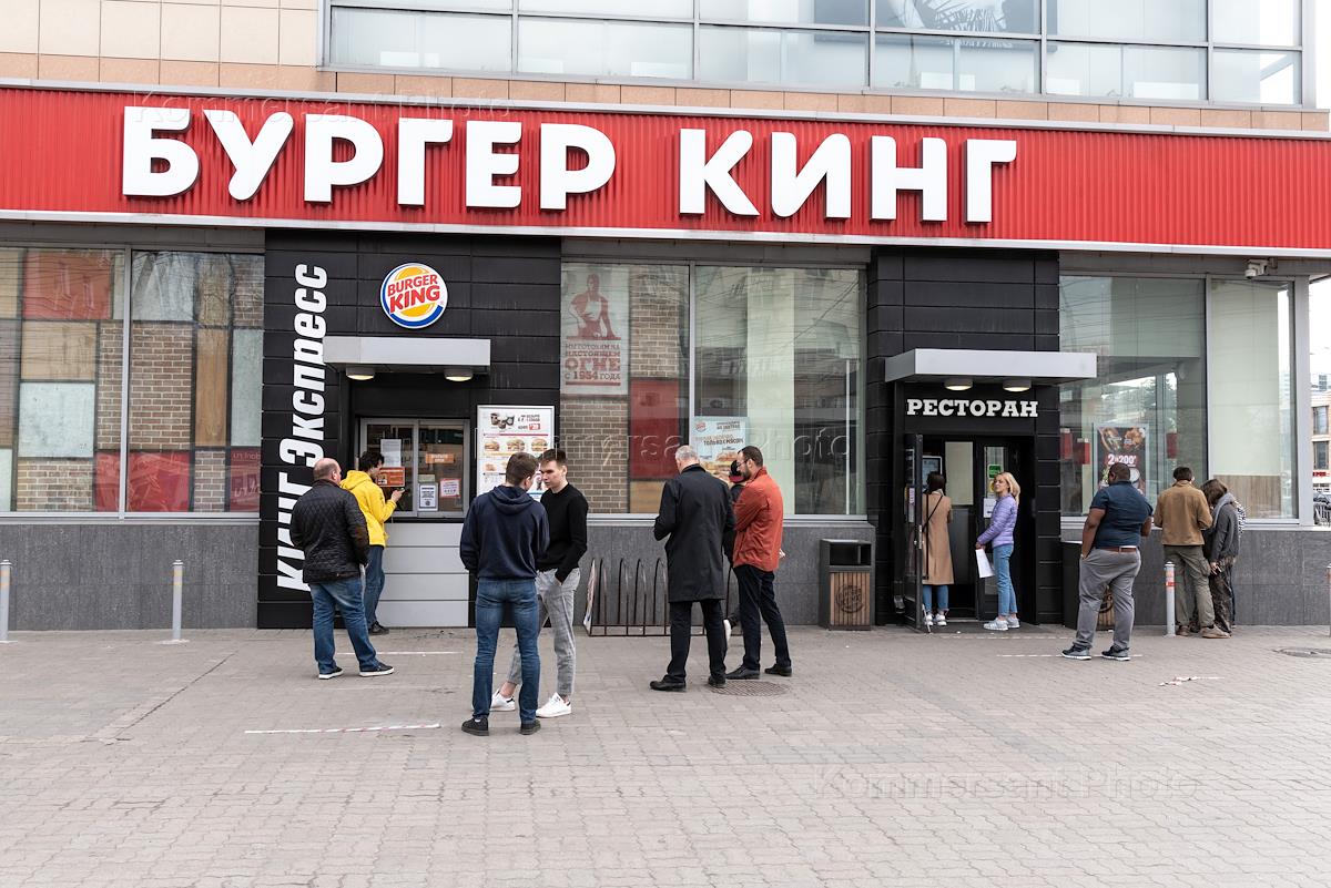 Меры предосторожности и профилактики коронавируса COVID-19. Жанровая фотография. Люди стоят в очереди возле ресторана "Бургер Кинг" в ожидании выдачи заказов.