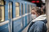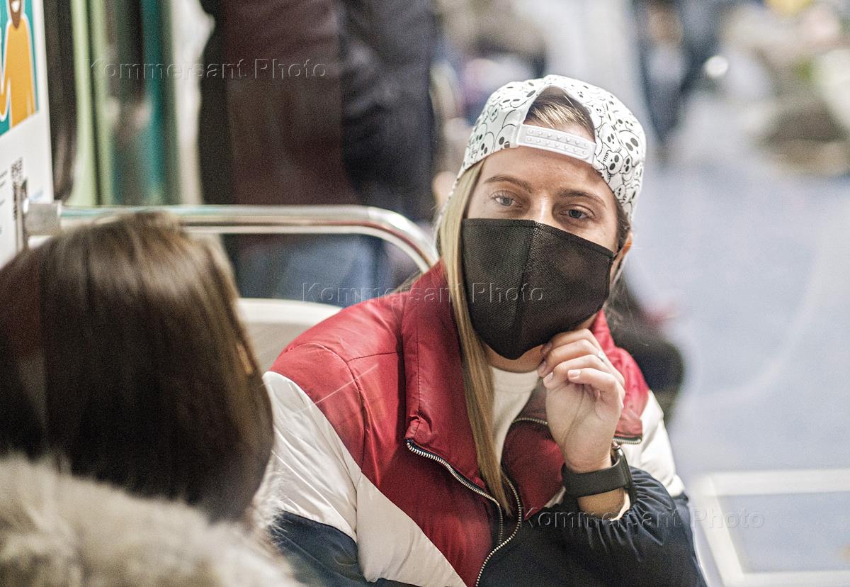 Новосибирск во время режима карантина из-за опасности распространения коронавирусной инфекции COVID-19. Жанровая фотография. Пассажирка в медицинской маске на станции Новосибирского метрополитена.