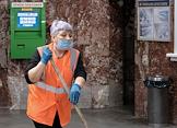 Новосибирск во время режима самоизоляции из-за опасности распространения коронавирусной инфекции COVID-19. Жанровая фотография. Сотрудница метро во время влажной уборки вестибюля станции.