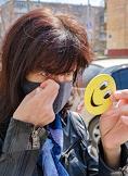 Новосибирск во время режима карантина из-за опасности распространения коронавирусной инфекции COVID-19. Жанровая фотография. Женщина в медицинской маске со смайликом в руках.