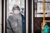 Новосибирск во время режима карантина из-за опасности распространения коронавирусной инфекции COVID-19. Жанровая фотография. Женщина в медицинской маске и резиновых перчатках в салоне автобуса.
