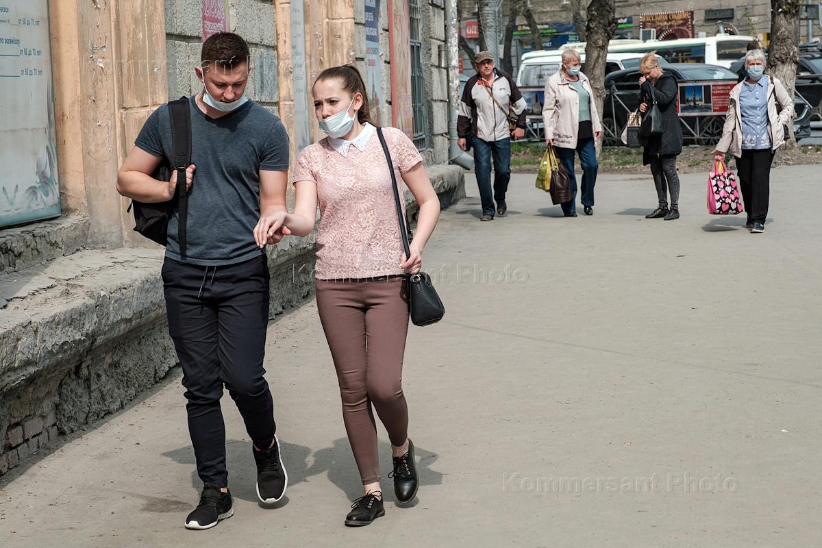 Новосибирск во время режима карантина из-за опасности распространения коронавирусной инфекции COVID-19. Жанровая фотография. Прохожие в медицинских масках.