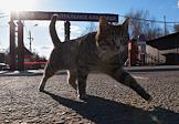 Москва во время режима самоизоляции из-за угрозы распространения коронавирусной инфекции COVID-19. Жанровая фотография. Кошка у входа на Хованское центральное кладбище.