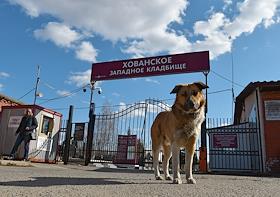 Москва во время режима самоизоляции из-за угрозы распространения коронавирусной инфекции COVID-19. Жанровая фотография. Собака у ворот Хованского западного кладбища.