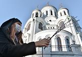 Празднование Вербного Воскресенья (Вход Господень в Иерусалим) во время пандемии коронавируса COVID-19. Жанровая фотография. Ветки вербы и крест на куполе церкви.