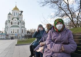 Празднование Вербного Воскресенья (Вход Господень в Иерусалим) во время пандемии коронавируса COVID-19. Жанровая фотография. Пожилые женщины в медицинских масках на лавочке у храма.