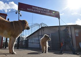Москва во время режима самоизоляции из-за угрозы распространения коронавирусной инфекции COVID-19. Жанровая фотография. Сотрудник охраны и собаки у ворот на входе на территорию Хованского западного кладбища.