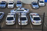 Москва во время режима самоизоляции из-за опасности распространения коронавирусной инфекции COVID-19. Жанровая фотография. Площадка для стоянки автомобилей дорожно-патрульной службы (ДПС) полиции у здания отделения.