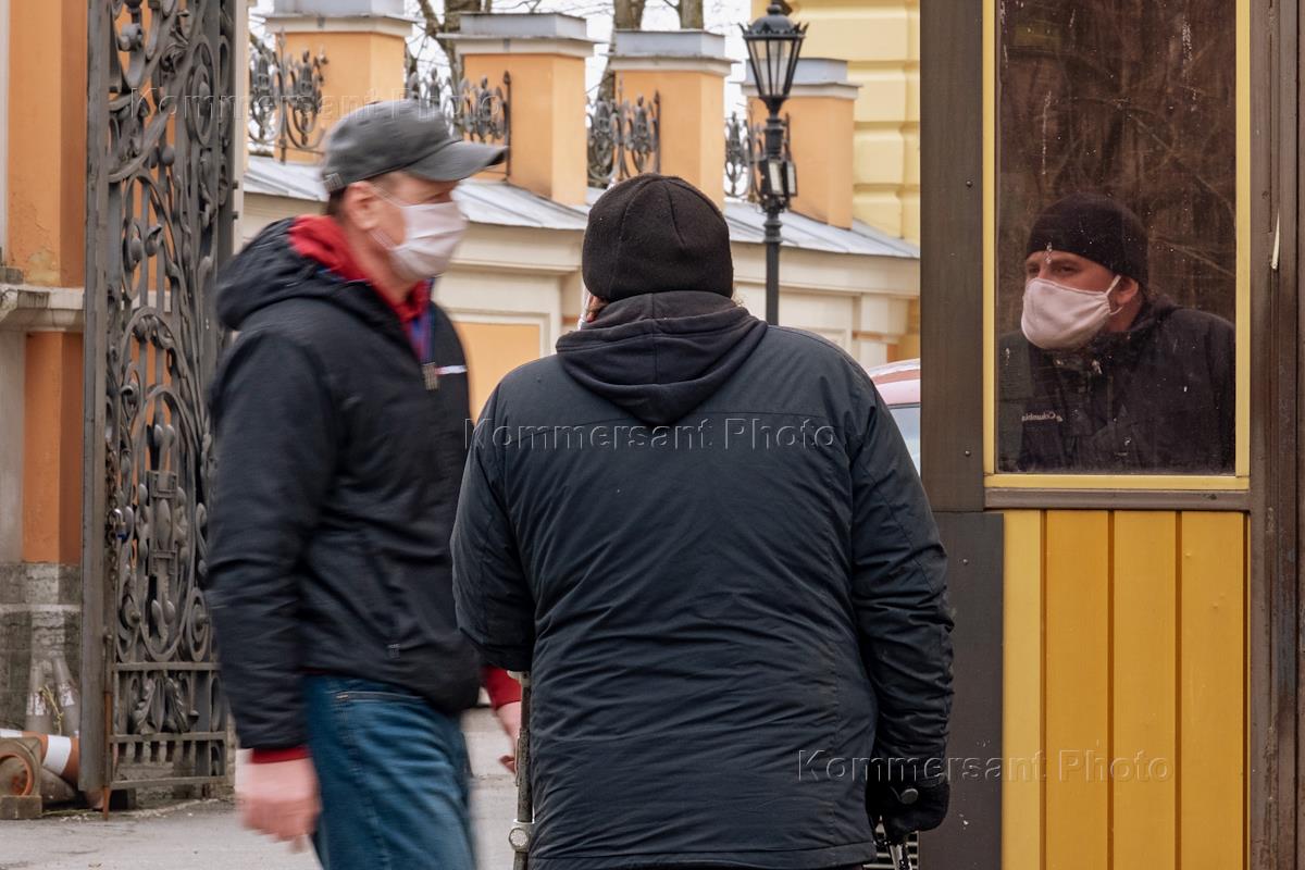 Санкт-Петербург во время режима самоизоляции из-за угрозы распространения коронавирусной инфекции COVID-19. Жанровая фотография. Жители города в медицинских масках на территории Александро-Невской лавры.