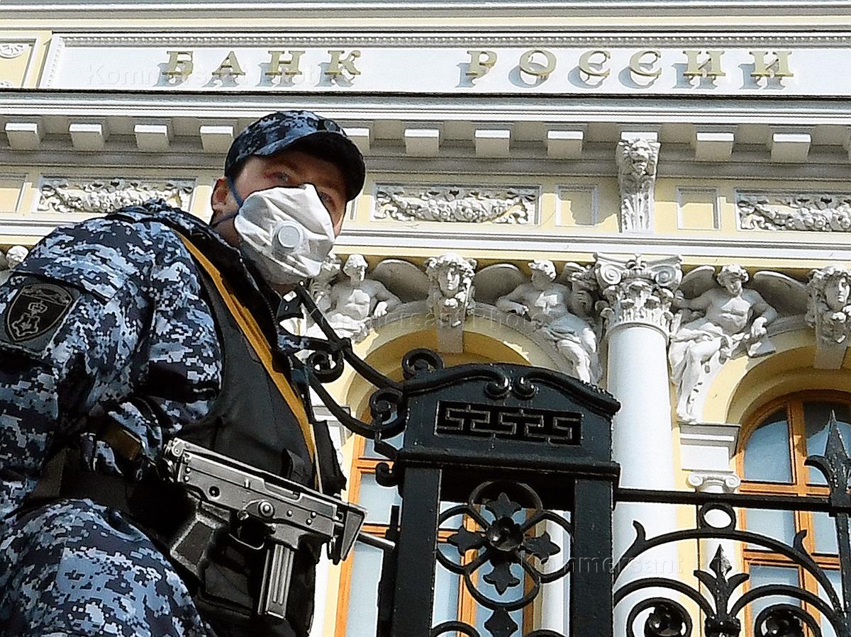 Москва во время режима самоизоляции из-за угрозы распространения коронавирусной инфекции COVID-19. Жанровая фотография. Сотрудники полиции в медицинских масках проходят мимо здания Центрального банка России.