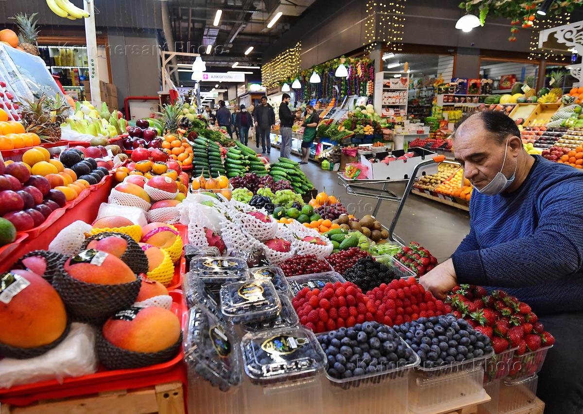 Оптово-розничный продовольственный центр "Фуд Сити" во время режима самоизоляции из-за опасности распространения коронавирусной инфекции COVID-19. Продавец у прилавка с фруктами.