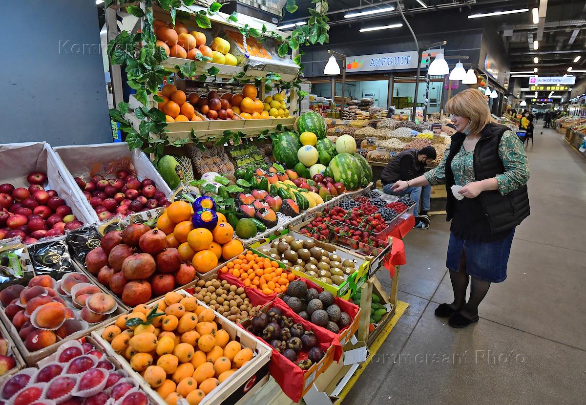 Оптово-розничный продовольственный центр "Фуд Сити" во время режима самоизоляции из-за опасности распространения коронавирусной инфекции COVID-19. Продавщица у прилавка с фруктами.