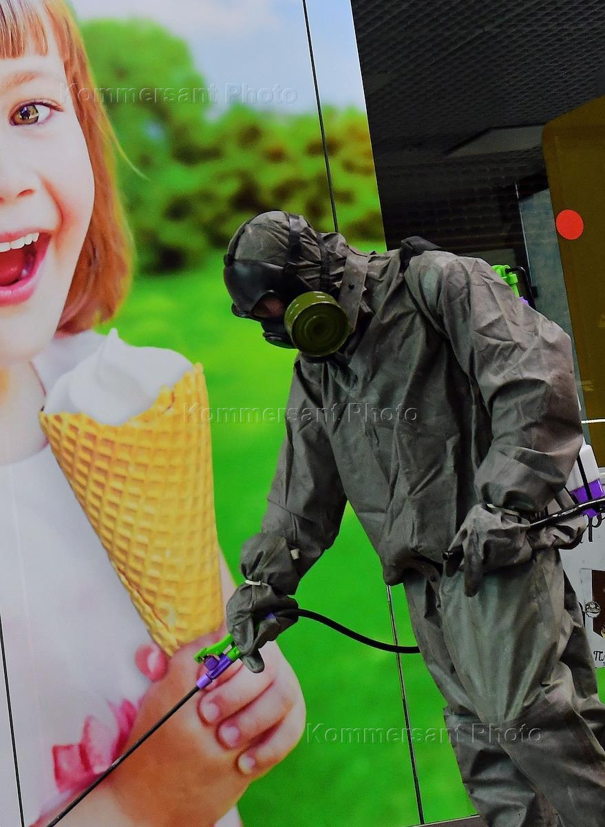 Оптово-розничный продовольственный центр "Фуд Сити" во время режима самоизоляции из-за опасности распространения коронавирусной инфекции COVID-19. Сотрудник центра в защитном костюме и противогазе во время дезинфекции помещения.