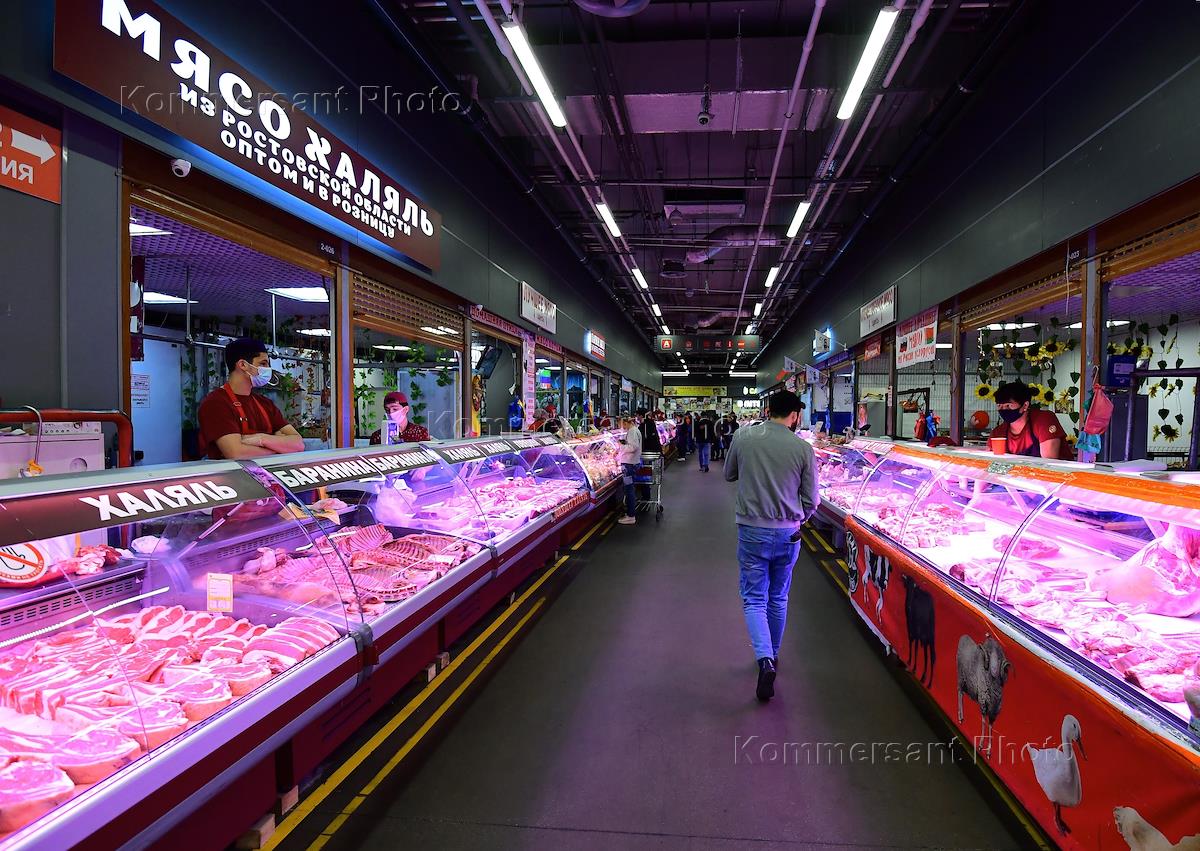 Оптово-розничный продовольственный центр "Фуд Сити" во время режима самоизоляции из-за опасности распространения коронавирусной инфекции COVID-19. Покупатель проходит мимо прилавков с мясом.