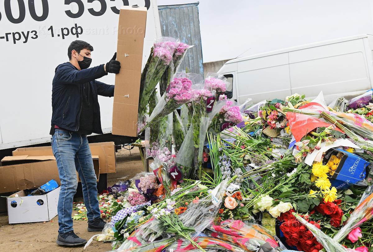 Consequences of the self-isolation regime caused by the danger of the coronavirus COVID-19 spread. Flower shops depose of flowers that have wilted due to the quarantine and self-isolation.