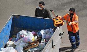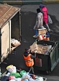 Москва во время режима самоизоляции из-за опасности распространения коронавирусной инфекцией COVID-19. Жанровая фотография. Сотрудники коммунальных службы в медицинских масках во время сортировки мусора.