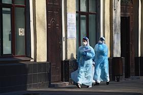 Moscow during self-isolation regime caused by the danger of the coronavirus COVID-19 spread. Genre photo. Medical workers wearing protective suits on Malaya Bronnaya Street.