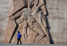 Views of Moscow during self-isolation regime caused by the danger of the coronavirus COVID-19 spread. Genre photo. Arbatskie Vorota Square. Passers-by wearing face masks.