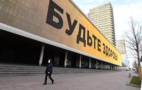 Views of Moscow during self-isolation regime caused by the danger of the coronavirus COVID-19 spread. Genre photo. New Arbat Street. Inscription on the facade of the Moscow Book House reading "Stay healthy!"