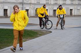 Views of Moscow during self-isolation regime caused by the danger of the coronavirus COVID-19 spread. Genre photo. Yandex.Food Delivery Service couriers on Vozdvizhenka street.