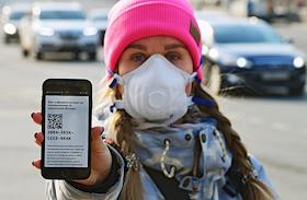 Moscow during self-isolation regime caused by the danger of the coronavirus COVID-19 spread. Genre photo. Young woman wearing face mask demonstrates her digital pass to travel around Moscow on her mobile phone screen.