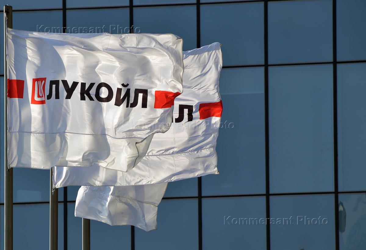 Виды Москвы во время режима самоизоляции из-за опасности распространения коронавирусной инфекцией COVID-19. Жанровая фотография. Флаги компании "ЛУКойл" у главного офиса компании на Сретенском бульваре.