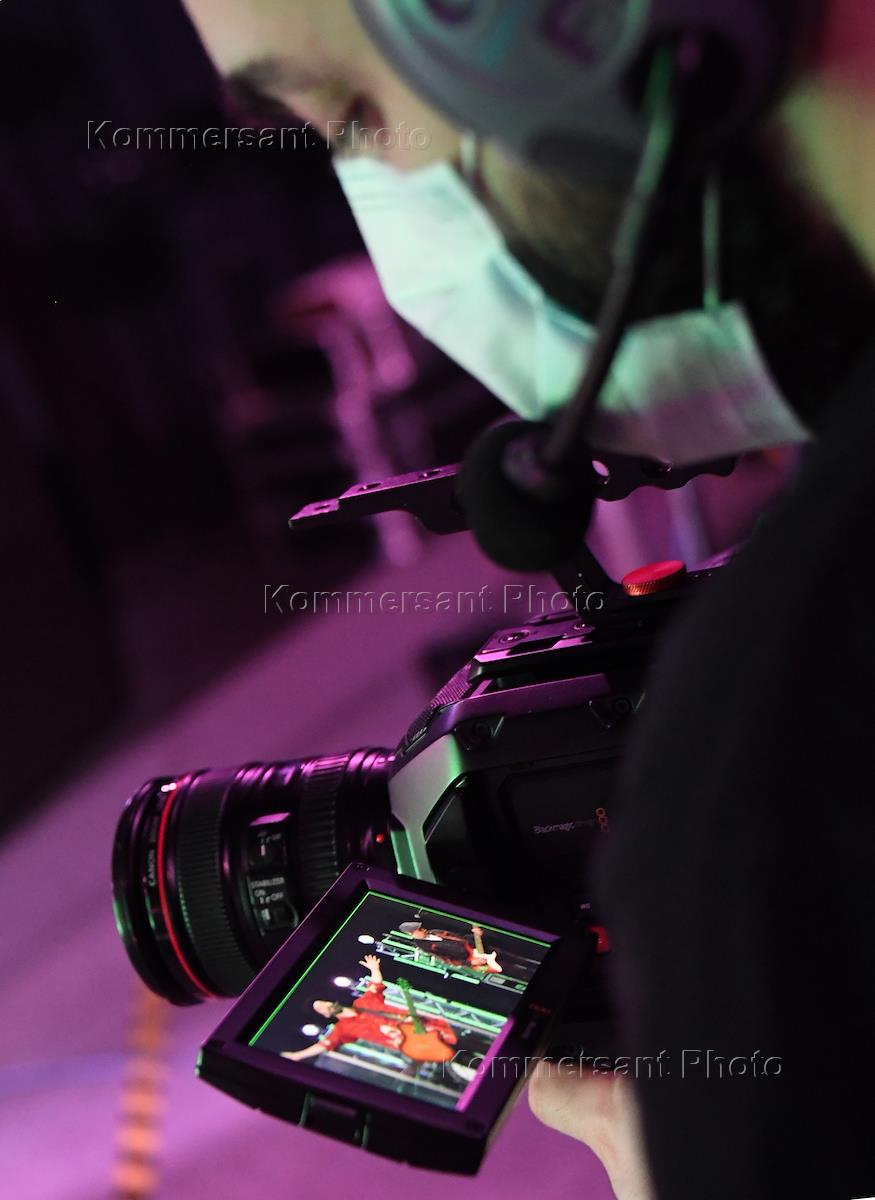 Режим самоизоляции из-за опасности распространения коронавирусной инфекцией COVID-19. Акция #МыВместе. Съемка благотворительного онлайн-концерта группы Uma2rman в студии. Жанровая фотография. Оператор в медицинской маске во время съемки концерта.