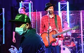 Self-isolation regime caused by the danger of the coronavirus COVID-19 spread. #WeAReTogether event. Filming of an online charity concert by Uma2rman band in the studio. Genre photo. Cameraman wearing face mask shoots the concert.