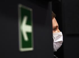 Moscow during self-isolation regime caused by the danger of the coronavirus COVID-19 spread. Genre photo. Man wearing face mask.