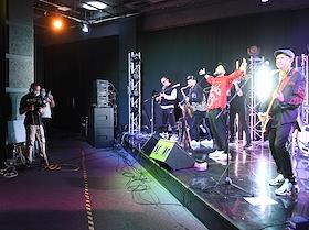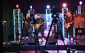 Self-isolation regime caused by the danger of the coronavirus COVID-19 spread. #WeAReTogether event. Filming of an online charity concert by Uma2rman band in the studio. Genre photo. Photographer shoots the concert.