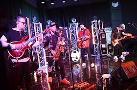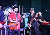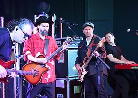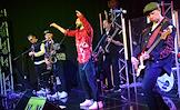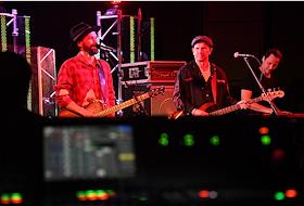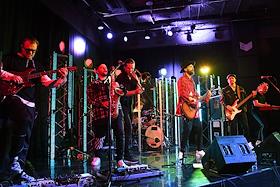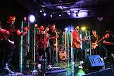 Self-isolation regime caused by the danger of the coronavirus COVID-19 spread. #WeAReTogether event. Filming of an online charity concert by Uma2rman band in the studio. Frontman of the band Vladimir Kristovsky (third from right) performs during the concert.